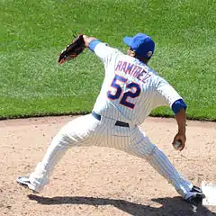 Ramírez was traded to the Kansas City Royals on March 26, 2008, for a player to be named later (Jorge de la Rosa).[3][27] He posted a 0.66 ERA through his first 13 games with the Royals, but his ERA rose to 3.49 after he posted a 6.14 ERA in his next 13 games.[28] Over his final 45 games, he had a 2.08 ERA.[7] On June 25, in a 73 victory over Colorado (his former team), Ramírez threw two pitches behind Yorvit Torrealba of the Rockies. Ramírez said he was not trying to hit Torrealba, and he was not ejected from the game or disciplined, but some of the Rockies players claimed that Ramírez had thrown at Torrealba intentionally.[29] On July 20, he got his first win since May 21 of the previous year in an 87 victory over the Chicago White Sox, despite blowing the lead by giving up two runs in 1+13 innings.[30] Ten days later, he pitched 1+13 scoreless innings and was charged with the win in a 43 victory over the Oakland Athletics, helping the Royals sweep the Athletics in Oakland for the first time since 1988.[31] By September, he had replaced Ron Mahay as Joakim Soria's setup man.[28][32] He pitched in 71 games for the Royals with a 2.64 ERA. On September 4, in the second game of a doubleheader, Ramírez notched his first career save against the Athletics in a 96 victory.[33] Ramírez finished the year with a 32 record, a 2.64 ERA, one save, 70 strikeouts, and 71+23 innings pitched in 71 games. He was one of three major league pitchers to give up two or fewer home runs in over 70 innings (along with Roy Corcoran and Jason Grilli), and he was one of the American League (AL) pitchers to have an ERA under 3.00 with at least 70 innings pitched and 70 strikeouts (along with Francisco Rodríguez and Matt Thornton).[7]