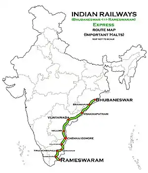The 18495 / 96 Rameswaram–Bhubaneswar Express runs from Rameswaram via, Manamadurai Junction, Sivaganga, Devakottai Road, Karaikkudi Junction, Tiruchirappalli Junction, Thanjavur Junction, Kumbakonam, Viluppuram Junction, Chennai Egmore, Vijayawada Junction, Visakhapatnam, Bhubaneswar.