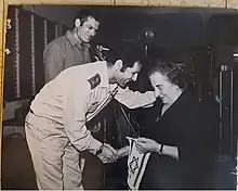 Lt.Col. Menachem Eini is shaking Golda Meir's hand while presenting the prime minister with the Israeli flag that Lt. Col. Rami Harpaz (on the left) has knitted in captivity, Nov. 1973.