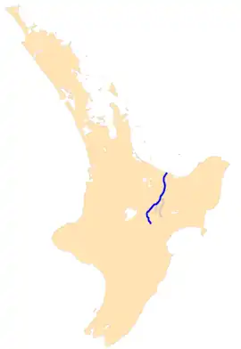 The river is 155 kilometres (96 mi) long, rising at an elevation of 740 metres (2,430 ft) [7] above mean sea level, 32 kilometres (20 mi) east of Lake Taupo and 130 kilometres (81 mi) south of the Bay of Plenty coast. From its source in the Ahimanawa Ranges[2] it flows for 64 kilometres (40 mi) across the Kaingaroa Plains towards Murupara.[8] Near the northern edge of the plains the river has been dammed by the Rangitāiki Dam, approximately 18 kilometres (11 mi) downstream of its confluence with the Wheao River. The dam diverts all but at least 0.5 cumecs into the Wheao and Flaxy power scheme, which discharges into Wheao River which joins the Rangitaiki upstream of Murupara.