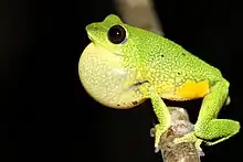 The species was described from the southern edge of the Nilgiris in the Silent Valley region. They are variable in colour but are green above with patterns of black blotches and spots. Scientists found one adult male frog that measured 26.9 mm in snout-vent length. The skin of its back was green and the skin of its belly was yellow. There were purple-black spots near the legs. Different frogs can have different marks. There is no webbed skin on the front feet and some webbed skin on the back feet. The underside is yellow with black or purple spots and streaks. The toe-pads are purplish. They have a distinct advertisement call given from tree perches at about 2 metres above the ground.[3]
