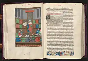 Raphael de Mercatellis began buying books early in life, after having been appointed abbot of St. Peter's abbey in Oudenburg. When he arrived at the wealthy Saint Bavo's Abbey, he used funds from the abbey to commission more and more costly manuscripts.[2] The books commissioned by de Mercatellis were luxuriously made, written on fine parchment and bound in colourful damask, silk or camlet bindings. They often contain his coat of arms and an unidentified monogram, LYS or SLY.[1][4][6] All the manuscripts in his library were commissioned by him, not bought second-hand or ready-made, which is very unusual for a medieval collection.[1] They were made in workshops in Bruges and Ghent. It is possible that de Mercatellis wrote the text of some of the books himself, acting as his own scribe.[7] Commissioning handwritten and decorated books in this way was already becoming old-fashioned during this time, as printed books had started to replace hand-written manuscripts.[8] In fact, miniatures found in several books ordered by de Mercatellis were copies of woodcut prints.[9] Ordering handmade books in this way could have been a way for him to appear distinguished and learned, and could also have been a way to showcase his wealth.[4]
