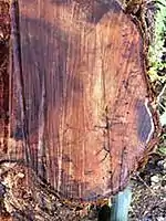 Ceratocystis Huliohia: This fungal pathogen was confirmed by plant pathologist Lisa Keith and her lab team in 2014.[13] Keith and her team asked local Hawaiians what they wished to coin the disease as, and they decided to call it Ceratocystis Huliohia (changes the natural state of ʻŌhiʻa).[13] This fungal pathogen has been found to create a canker disease beneath the bark that slowly spreads throughout the water-conducting tissue within the tree, leading to wilting leaves, dried out branches and ultimately, the death of the tree.[13] In both ROD fungal pathogens, signs of the disease have been shown in the outer ring of the cut trunk.[14] Additionally, scientists have found through systematic dissections of the tree that the darkest portion of the bark is where the fungus has entered, and that predominantly the fungus has been found that the disease grows quicker up the stem of the tree than down it.[14] Researchers have also been studying how the excrement created by Boring Beetles within the ʻŌhiʻa trees can be used as a pathway for both pathogens of ROD.[12]