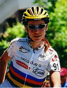 ![]() Rasa Polikevičiūtė during the introductions prior to one of the stages of the 2002 Women's Challenge stage race. She is wearing the Rainbow Jersey which signifies that she was the (then) current World Road Race Champion. | ||||||||||||||||||||||||
