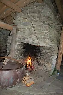 The Raudsjø Valley lies high in the mountains, at an elevation of 900 meters (3,000 ft),[7] and is difficult to access. Construction began on June 12, 1856. A team of 37 workers and 38 horses stayed for three weeks to build the large stone dairy building.[2][8] In addition, the dairy was equipped with a barn that could accommodate 100 cattle.[2][3] In addition to a cheese-making room with an open hearth, the dairy building also had a milk house and a storage room for the finished cheese (an Emmental cheese).[3]