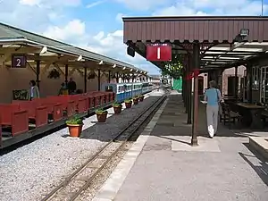 When the new company took over in 1960, the waiting shelter was converted into a cafe for visitors. In 1966 the footbridge from Coniston was installed just before the turntable. The 1930s layout lasted until 1967 when the present two platform layout was adopted. The lever frame from Birgham signal box was installed in a box opposite the workshops and general manager's office (the 1927 bungalow) in 1968/9. In 1972, awnings were erected over platforms 2 and 3, recovered from Millom station. In 1978 a two storey toilet and office building was built next to the old waiting shelter on platform 1.[1] Shortly afterwards, a second canopy was erected over platform 1, using fittings recovered from Whitehaven Station. A new ticket office and shop was built in 1983 next to the car park. The 1920s waiting shelter lasted until 2011, when it was replaced by a 2-storey cafe similar in style to the building built at Dalegarth in 2005.