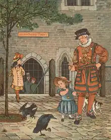 The first two known depictions of ravens in the Tower of London both date from the year 1883. One is in a special edition of the newspaper The Pictorial World and the other is from the children's Book London Town,[42] written by Felix Leigh and illustrated by Thomas Crane and Elizabeth Houghton.[43]: 50–53