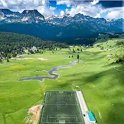 ![]() Stadium Ravni Žabljak with mountain Durmitor behind | |
