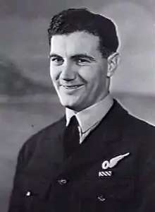 During the war he served as a warrant officer and in 1943 was awarded a Distinguished Flying Cross, along with his pilot Arthur Simpson (408881), for their efforts in a bombing operation over Germany.[8] They were flying over Hanover on a Lancaster bomber when the airscrew of a German night fighter tore a hole under the plane's nose, which resulted in the plane falling 3000 feet. Despite this, they were able to recover and still achieve their objectives in dropping the bombs at their target.[9]