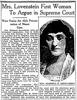 Rebecca Pearl Lovenstein (1888–1971) was one of the first two women to pass the written bar exam in the state of Virginia in 1920.
