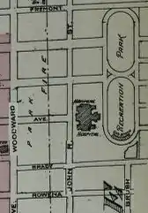 Across the centerfield fence, to the north, was the other half of the Recreation Park complex, a cricket field. Contemporary maps depict an oval track around the cricket field, as with the baseball field, and a larger oval enclosing the entire property. The northern boundary of the property, according to initial contemporary newspaper accounts, was Fremont Street (now Canfield Street). Later accounts placed the northern border at Willis Street, a block south of Fremont / Canfield.