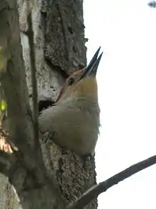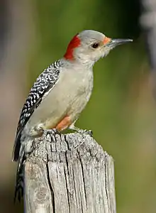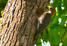 Red-bellied woodpeckers depend on dead trees for nesting.[16] Recent studies have shown that these woodpeckers experienced low breeding due to cutting sites of dead trees; however, predators are still of main concern.[16][17] The juvenile red-bellied woodpecker is ready to fledge at 24 to 26 days of age. Natal dispersal has been observed in juvenile red-bellied woodpeckers.[15] The juvenile red-bellied woodpecker remains in its natal area for approximately 27 weeks after fledging.[15] In some cases, the woodpecker may return to its natal area for breeding, depending on predation levels and food resources.[15]