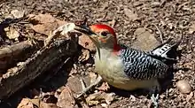 As with all animals, foraging plays an important role in an animal's ability to survive and reproduce. The red-bellied woodpecker expresses foraging behavior by catching or storing food.[18] The woodpecker uses its bill as a chisel, drilling into bark or probing cracks on trunk of trees.[18] In this manner, it is able to pull out beetles and other insects from the tree with the help of its long tongue.[18] This behavior is also seen in storing food from other animals by hiding food behind bark or deep in cracks of a tree.[18] According to studies from Williams (1975),[19] Breitwisch (1977),[20] and Williams and Batzil (1979),[21] the red-bellied woodpecker spent 20% to 69% of its time foraging on dead or decaying trees.[22]:351 In addition, Breitwisch (1977)[20] observed red-bellied woodpeckers primarily gleaning and probing to find food in South Florida pine habitat.[22]:351[23]:5 The red-bellied woodpecker relies on snags or dying trees for foraging and nesting.[14] It is a major predator of the invasive emerald ash borer in the U.S. Midwest, removing up to 85 percent of borer larvae in a single infested ash tree.[24] The red-bellied woodpecker has also been observed, on occasion, foraging on the ground amongst groups of Northern Flicker woodpeckers.