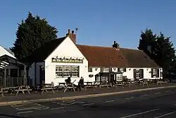 A tollbridge to the west bank of the Adur at Lancing was built in 1782. This, and the diversion of the road eastwards to the seaside resort of Brighton, caused the focus of the village to move westwards, towards the river and the west end of the old village street. A cottage,[3] apparently part of a former monastery,[4] stood on the old road near the tollbridge.[1] It was converted into an inn under the sign of the Red Lion.[3] The building was extended and lengthened to the north and south later in the 18th century and in the 19th century.[3] It developed trade as a coaching inn[4] serving the roads towards Brighton (eastwards) and Steyning (northwards, along the bank of the river). In the 1920s, the main road to Brighton was realigned again: thereafter it ran immediately south of the inn.[1]