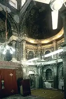 The triconch sanctuary is very fine. It has three apses that are embellished by two orders of superposed niches separated by small elegant columns. These columns are completely painted, and lend to the spaces' richness and sacredness. The motif of the broken tympanum surmounting each niche is particularly interesting. Attached to the haikal (sanctuary) screen that shields the sanctuary from the public areas are icons of Saints Shenute, Bishoi and Bigoul. The north and south apses have no altars.