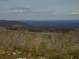 The views from the top of the mountain are impressive and varied. To the south you view the Ridge and Valley Appalachians region, in the other three directions you look out over the deeply dissected Allegheny Plateau. Huckleberry and North Mountain summits may be seen to the west. These mountains are some of the higher peaks in this region of Pennsylvania.