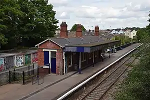 Facilities at the station are minimal – there are a few chairs and timetable information is provided. Help points, giving next train information, were installed in 2010. There is no ticket office, but a self-service ticket machine is available.[6] The Victorian-era station building is the only original station building left on the line,[7] decorated with a mural painted by local students,[8] it is used as an upholsterer's showroom rather than for railway purposes.[9] Access is step-free from South Road, through an area containing residents' garages. The platform backs onto the gardens on the south side of the road.[6]