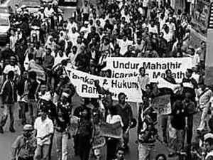Reformasi is a political movement in Malaysia. It was initiated in September 1998 by Anwar Ibrahim, former Deputy Prime Minister of Malaysia, after he was sacked from his position by Malaysia's then-Prime Minister, Mahathir Mohamad. The movement, which began while the country hosted the Commonwealth Games, initially demanded the resignation of Malaysia's then-Prime Minister, Mahathir Mohamad, and for the end of the Barisan Nasional-led (BN) government. It later became a reformist movement demanding social equality and social justice in Malaysia. The movement consisted of civil disobedience, demonstrations, sit-ins, rioting, occupations and online activism.[1]