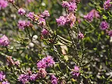 Regelia cymbifolia is a plant in the myrtle family, Myrtaceae and is endemic to the south-west of Western Australia. It is a much branched shrub bearing tiny, wedge shaped leaves and clusters of deep pink to purple flowers on the ends of its branches in spring.