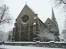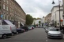 The northern part of the street dates back to at least the eighteenth century and was known as Primrose Vale. Like the rest of the area it was laid out as a residential area in nineteenth century, with many of the original buildings surviving. There had been an older Chalk Farm Tavern on what is now the street, which was famous as a site of dueling in eighteenth century and Regency London, but was rebuilt in the Victorian era.[1] The stretch of street south of the Queen's Hotel was originally known as Queen's Street, but later the whole road adopted the same name. The Anglican St Mark's Church was opened in 1852, and then rebuilt following German bombing in the Second World War.