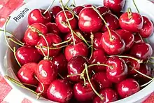 The Regina was developed at the Jork Fruit Research Station in Germany, and is considered the most successful sweet cherry cultivar to have been developed there.[1] First introduced in 1998, Regina is a cross of the 'Schneiders Spate Knorpelkirsche' and 'Rube' cultivars.[2] Apart from Europe, it is also grown commercially in Oregon[3]