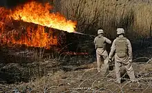 Flamethrowers can be used to clear brush, as demonstrated by United States Marine Corps soldiers in Fallujah, Iraq in 2008. International agreements ban the United States from using flamethrowers in combat.