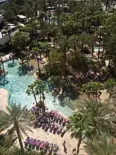 Rehab remained popular a decade after its opening. Aside from pool renovations and expansions, the event stayed largely the same over the years, a fact that the Hard Rock Hotel cited as a reason for Rehab's success.[6] In 2013, Rehab hosted a bikini contest called the Bikini Invitational,[33][34][35] which became a yearly event at Rehab.[36][22][37] New bungalows were added to the event in 2015, followed by a revamped stage in 2016.[38] In June 2018, it was announced that Rehab would come to an end later that year, as new owners prepared to renovate the Hard Rock and rebrand it as Virgin Hotels Las Vegas.[39] Rehab held its final pool party on October 14, 2018.[20][40]