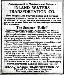 On October 19, 1924, the Inland Waters Transportation Company announced that it would inaugurate steamboat service, using Relief, running on the Willamette River from Salem to Portland.[34] Relief was to depart Salem for Portland at 6:00 a.m. every Wednesday, Friday, and Monday, and return to Salem on Tuesdays, Thursdays, and Sundays.[34] Capt. Fritz Kruse was to have command of Relief.[34] Robert Kerns was to be the chief engineer.[34] Freight alone would be carried, and no passengers.[34] To receive freight, the company had built a warehouse in Salem at the intersection of Court and Water streets.[34]