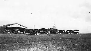 94th Aero Squadron - Flightline at Rembercourt Aerodrome, France, late October 1918. Note the wind-direction flag on the headquarters building. It was captured from the German Stenay Airdrome