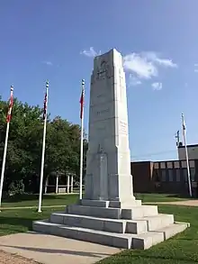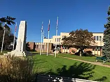 Low Square is located at the corner of Raglan Street and Railway Avenue in downtown Renfrew. The square is a park setting containing the cenotaph, and the Town Hall. In 1918, with approval of Council, and at his own expense, the Honourable Thomas Low donated and landscaped the property as a gift to the town for the purpose of constructing a cenotaph to honour local soldiers who died in The Great War, but he died before it was unveiled. The Renfrew Police station (later the OPP detachment) was built as a small brown brick building on the back of the square in 1972, replacing the station directly to the south of it. A new town hall was constructed as an addition to the police station, in the 1980s, with municipal offices moving from the old Temperance Hall building directly across the street. In February 2017, the full building became town hall offices and Ontario Court of Justice offices when the police moved to a new location at 450 O'Brien Road. The name of Tom Low lives on in the Park he landscaped, which A.A. Wright declared "from this time on and for all time to be known as Low Square”.
