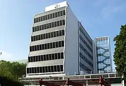 The building, which is made of concrete, consists of a two-storey base supporting a six-storey tower. There is a large glass-sided stair tower on the side. Inside is an entrance hall on two levels with a large mural titled Metamorphosis, by Victor Pasmore.