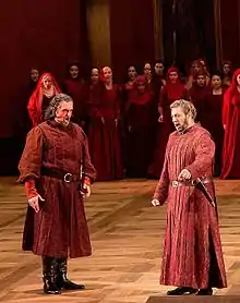 Domingo (right) as the Conte di Luna in Il trovatore with Riccardo Zanellato at the 2014 Salzburg Festival