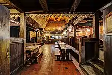 Another early forerunner of the restaurant was the inn. Throughout the ancient world, inns were set up alongside roads to cater to people travelling between cities, offering lodging and food. Meals were typically served at a common table to guests. However, there were no menus or options to choose from.[10]