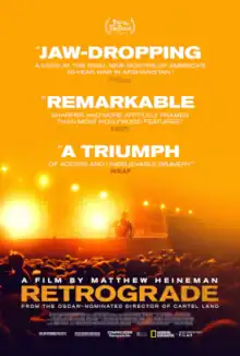 Retrograde is a 2022 American documentary film directed by Matthew Heineman that covers events that took place during the final nine months of America's 20-year war in Afghanistan. It had its U.S. premiere at the Telluride Film Festival on September 3, 2022, and had its Canadian debut at the Vancouver International Film Festival on October 2, 2022. It was released in select theaters in the United States starting November 11, 2022, by National Geographic Documentary Films and Picturehouse and was later made available on various streaming platforms. The film received critical acclaim, was nominated for the Directors Guild of America Award for Outstanding Directing in the Documentary Category at the Producers Guild of America Awards, and won the Doc NYC award at the annual documentary film festival.
