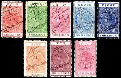 - ↑ 1867 Revenue Stamps. New Zealand Stamp Images, 2013. Retrieved 12 January 2014.
