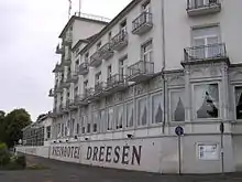 At his first visit to the hotel in 1926 Adolf Hitler checked in as "staatenloser Schriftsteller", meaning "stateless author". He returned there often afterwards. On the night of June 29th-30th, 1934 Hitler met with Joseph Goebbels and Sepp Dietrich in preparation for the Night of the Long Knives.[1] In September 1938 he moved the negotiations with prime minister Chamberlain regarding the Sudetenland[2] crisis to the hotel Dreesen. The hotel owner at the time was considered a "Half-Jew" according to Nazi ideology and had a jewish sister-in-law as well as numerous jewish relatives. Nonetheless, he was able to run his business unperturbed. According to an informant of the American journalist Nora Waln, who stayed in the hotel in the summer of 1934 immediately after Hitler, the owner at the time was "a childhood friend of the Führer".[3] William L. Shirer, an American journalist visiting the hotel in 1938, referred to the owner as "an early Nazi crony of Hitler".[1] In 1934, under the direction of local architect Willy Maß, the 2000 m² terrace ("Kastaniengarten") was fitted with an (at that time unique) electricity-powered glass roof. At the beginning of the war in 1939 the Hotel was seized by the German armed forces and served as a headquarters of the army high command under General Fedor von Bock. In February 1943, it became temporary accommodation for South and Central American diplomats under the French Vichy Regime while continuing to operate as a hotel. After the diplomats' leave in 1944/1945 it became primarily meant for French officers. During this time, from April 1944 at the latest, it functioned as a satellite camp of Buchenwald concentration camp under the cover name "Winzerstube" and was under military guard.[4]