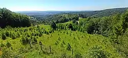 View from the route of the limes (Roman watchtower IX) in Rheinbrohl forest towards the Rhine valley with the Eifel in the background. Photo from June 2021