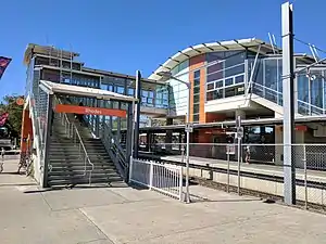 Both the Up platform and the Down island platform have been re-built using modern materials, the offices and buildings on the platforms have been replaced by a Booking Office on the overhead (new) footbridge between the platforms. Lifts have been provided between platforms and the overhead footbridge. The industrial sidings which were part of the Rhodes station arrangement were placed out of use and removed some years ago.[2]
