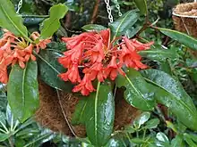 This is Rhododendron crassifolium growing in a basket hanging in a tree in a suburb of Seattle, Washington. It originally came from Borneo and was propagated by the Rhododendron Species Foundation.