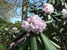 Rhododendron fulvum (Chinese: 杜鹃; pinyin: liánguǒ dùjuān) is a species of flowering plant in the heath family Ericaceae,[2] native to northern Myanmar and China. In China, it is found in southwest Sichuan, southeast Xizang, and western Yunnan.[3] It grows at altitudes of 2,700–4,400 m (8,900–14,400 ft). It is an evergreen shrub or small tree growing to 2–8 m (6.6–26.2 ft) in height, with leathery leaves that are oblanceolate to oblong-lanceolate or obovate, 8–20 by 3–7.5 cm in size. The undersides are felted with a striking cinnamon colour. The flowers, borne in trusses in spring, are loosely bell-shaped, pale rose pink, with a crimson basal blotch and sometimes red spots.[4]