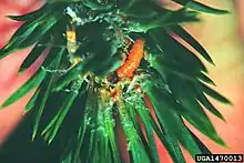 The larvae feed on various pine species. The larvae mine the current year's shoots of red, jack and Scots pine seedlings and saplings (it attacks the lower halves of trees up to 25 feet tall). Serious damage has been recorded in red and Scots pine plantations in Massachusetts, Pennsylvania, Virginia, Michigan, Wisconsin, and Ontario.