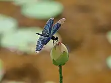 Rhyothemis fuliginosa is a short and stout dragonfly with a body length of 32-41 millimeters in length. The wings are 30–40 mm across and patterned with a deep blue iridescent shade.[11][3] Depending on the viewing angle, the dragonfly's wings can vary in color due to their light scattering properties, with some appearing golden in the light.[4][9] The wing patterns are thought to be a determinant between members of the same species to avoid mating with the incorrect partner.[3]