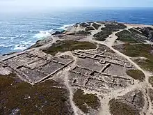The ribat is located on the Ponta da Atalaia, about 1 km north of Arrifana Beach. It was constructed around 1130, probably by the Sufi and Mahdi master of Christian origin, Abu-l-Qasim Ahmad ibn al-Husayn ibn Qasi, one of the leading political and religious figures in al-Andalus, the Muslim territory that covered most of Iberia during the Islamic Golden Age. Between 1130 and 1140 Ibn Qasi wrote his main work, The Removal of the Sandals, which was inspired by both the Old Testament and the Quran. In 1151 he was assassinated in Silves after being accused of betraying Islam by the followers of Abd al-Mu'min and Ibn Almúndir. After this the Ribat of Arrifana was abandoned, with the English crusader and chronicler, Roger of Hoveden, reporting forty years later that it was “recognizable but in ruins”. It is believed that the minaret was used as a watchtower in the fourteenth century. Despite appearing in written records dating back to 1786 and being clearly identifiable as a former inhabited area as late as 1841,[1] the location of the ribat was only identified by archaeologists at the beginning of this millennium. Its architectural features are inspired by the ribats identified in North Africa.[2] [3][4][5]