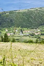 The community itself is divided into areas located within the Ribeirinha river-valley, and portions that are situated on several mountains and escarpments overlooking the same: Ribeirinha and Espalhafatos. Administratively, Riberinha is divided by borders along Lomba Grande (543 metres) and Lomba da Ribeira (209 metres) oriented west to east (both covered with many endemic species of plants, shrubs and trees natural to the Azores). Towards the interior, the plateau Trás-da-Serra is a feature of volcanic origins, as well as a protected countryside comprising many farmlands and diverse natural views.