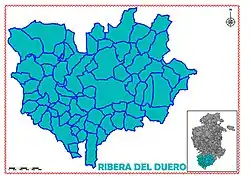 The Ribera del Duero is a comarca or district located at the southern tip of the province of Burgos, part of the Spanish autonomous community of Castile and León. The capital of the Ribera del Duero comarca or district is the town of Aranda de Duero.