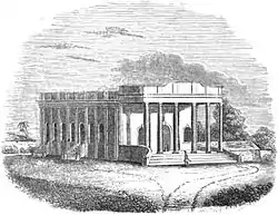 In 1851, the Canarese Chapel was raised on the grounds where Campbell's chapel stood. The building was much larger than the original chapel and was raised at a cost of BINR 3500 (£350), raised from the proceeds of the sale of the Mission House in Mysore.[23] The opening of the New Canarese Chapel at Bangalore was reported by Rev. Campbell, Rev. Rice and Rev. Sewell and published in the Missionary Magazine and Chronicle of April 1852, along with a sketch. The chapel stood as an impressive European Hall in the midst of native mud houses. The dimensions of the chapel were length of 53 feet, width of 32 feet and height of 20 feet. There was an verandah outside, which served for addressing the natives during weekdays, and vestry attached to the building. There was also an dwelling house for the native teacher and his family. The chapel was consecrated on 19 October 1851, with the opening services commenced by Rev. Rice. Others in[25] attendance included Rev. Daniel Sanderson of the Wesleyan Mission, Rev. James Sewell, Rev C Campbell, many other Europeans and many prominent residents of the Bangalore Petah.[24] In 1907, the Canarese Chapel was deemed as being structurally unsafe and was vacated.[26]