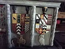 Arms and emblems on the Corbet/Savile tomb. These include the elephant, only adopted in the time of Sir Andrew, and the raven, referring to the etymology of Corbet, meaning "little crow".[12]
