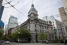 The Sinclair Centre, is a federal government office complex with a shopping complex at grade that was built by Henriquez Partners Architects in collaboration with Toby Russell Buckwell Architects in 1986. The Sinclair Centre was originally four separate historic buildings, but the renovation unified the buildings into one shopping mall by connecting them in a glazed atrium.[10] The federal government's wanted to have more of a presence of public services in Vancouver. Therefore, The program of Sinclair Centre was called to transform an entire block into government office complex mixed with retail and public functions and replacing the image of the building from being austere to being open and accessible.[10]