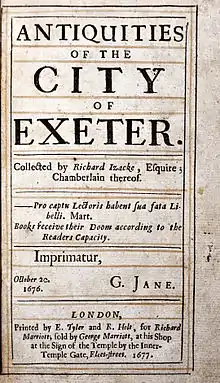 Richard Izacke (c.16241698) of Devon was an antiquarian and lawyer who served as Chamberlain of the City of Exeter. His history, Antiquities of the City of Exeter, was first published in 1677.