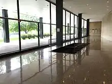 The split entrances occur near the entry points of the two back-to-back lecture halls, each seating roughly 250.[3] The interior spaces on the ground floor have exposed buff brick walls, the same as the exterior. The internal two fan shaped lecture halls, form a core with buff brick walls on the sides and curved wood walls on the ends. The floors on the first floor are a tan terrazzo. The interior finishes are not as luxurious in the upper three floors. These upper floors have do have the exposed brick interior walls, but the floors are black tile and the lighting is not recessed and smooth in with the ceiling plane.